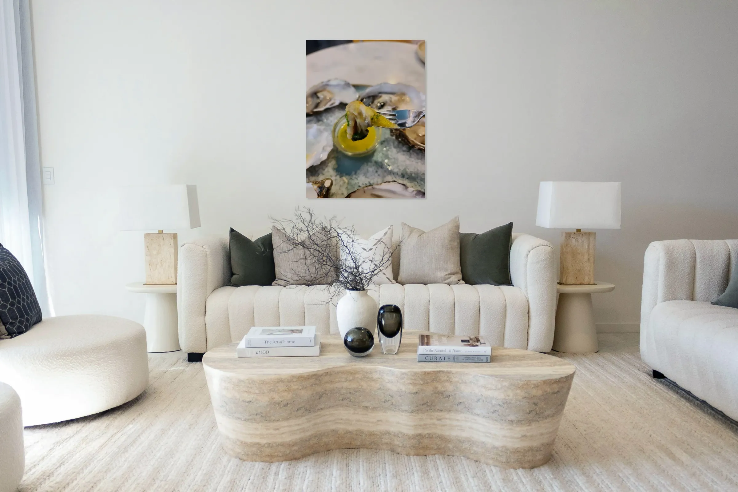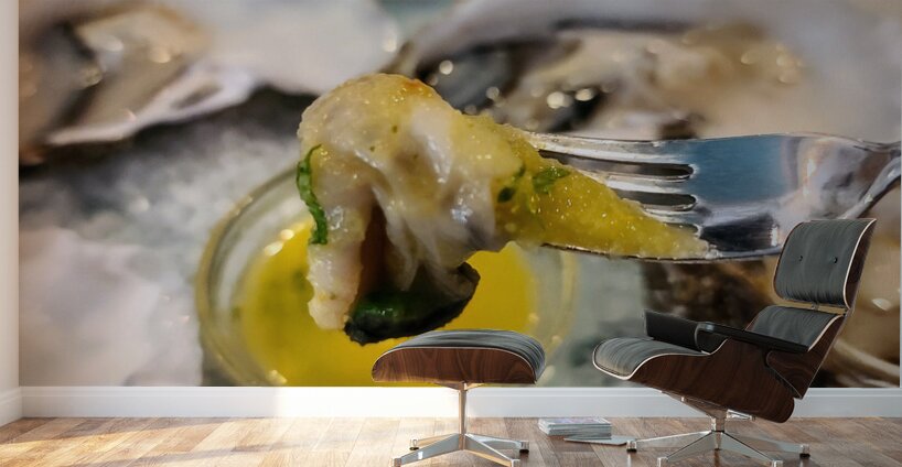 A quiet lament from the sea, “Elegy in Shell Minor” transforms a single bite into a visual composition of loss and luxury. The glint of lemon butter plays the high notes; the cool salt bed hums beneath. The oyster, caught mid-lift, becomes a final stanza in a song only the ocean remembers. As wall art, it blends mood, minimalism, and culinary sophistication—evoking both reverence and indulgence. A beautiful fit for piano nooks, moody kitchens, or dining spaces that embrace emotion and flavor in equal parts.