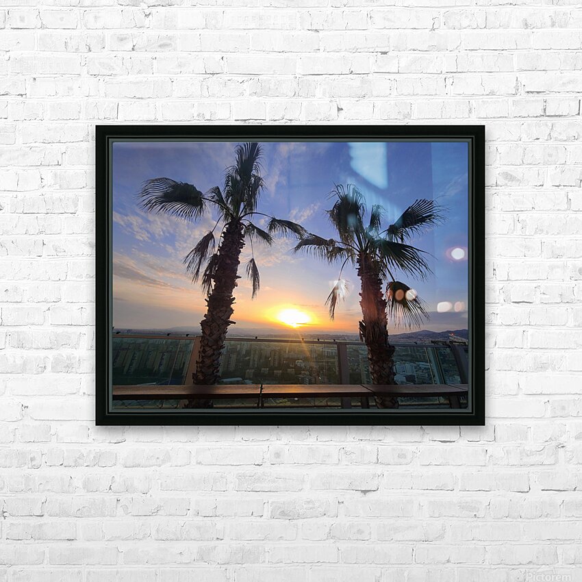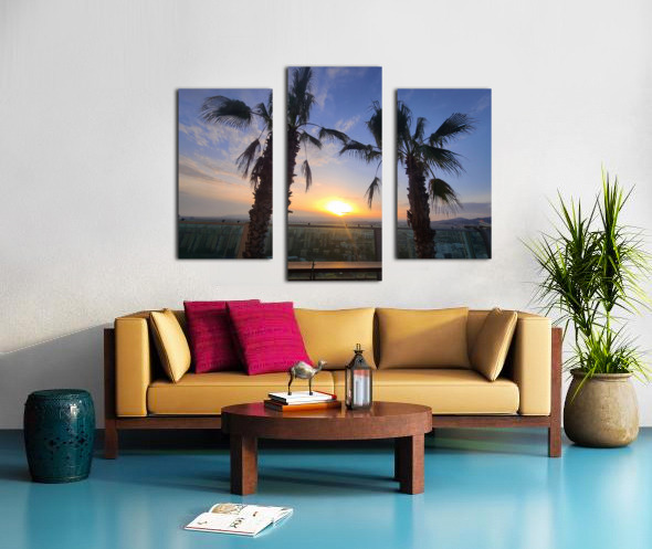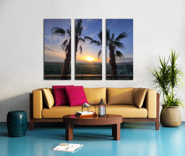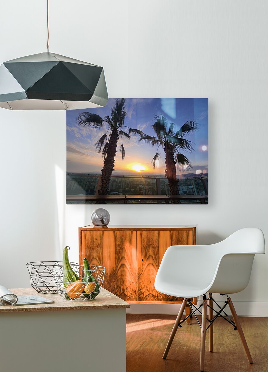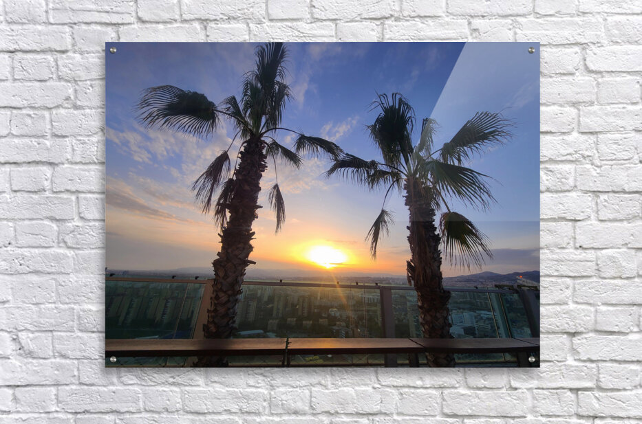 Palms Over the Skyline captures a rare juxtaposition—tropical stillness above the rhythm of city life. As the sun dips low, twin palm trees frame the last light of day, casting long shadows and cooling the warmth of dusk. The glass rail echoes the city’s sleek architecture, while the fiery sky nods to nature’s daily spectacle. This piece is perfect for those who crave the energy of the city but long for a breath of ocean air. Hang it in a modern loft or office to create a mood of balance and bold simplicity.