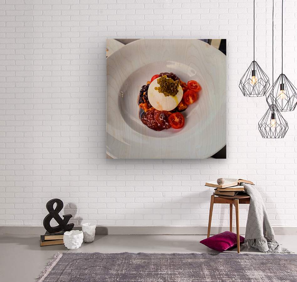 This piece elevates food to fine art. "Caviar & Cream" is a striking still life of gourmet textures and flavors presented with sculptural finesse. The pristine white plate acts as a blank canvas, showcasing the soft burrata orb topped with glistening caviar pearls, encircled by roasted and raw components in perfect symmetry. The image speaks to those who appreciate the elegance of simplicity and the decadence of flavor. As wall décor, it evokes refinement and culinary curiosity—perfect for a modern dining room or gallery kitchen.