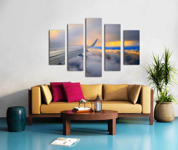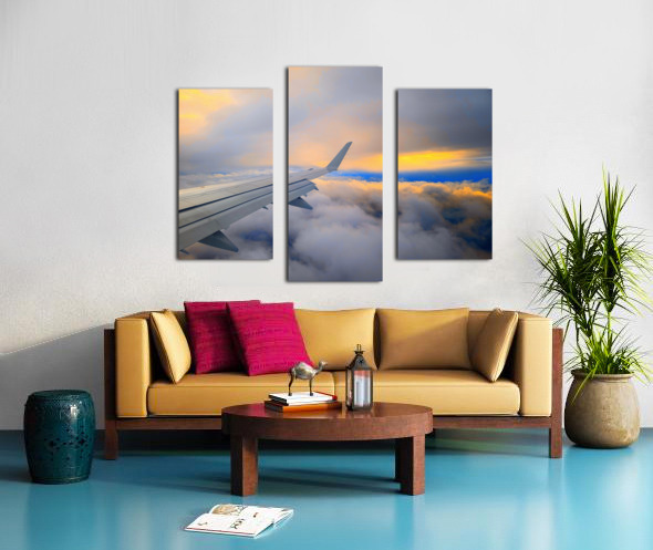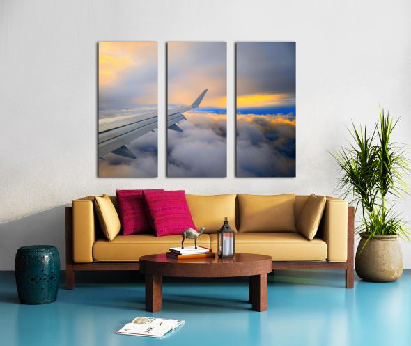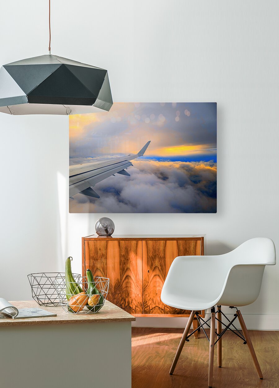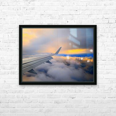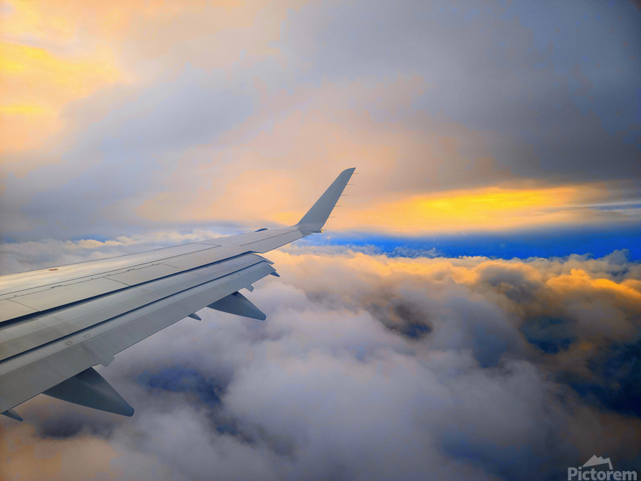Soaring above a sea of clouds, this image captures the serene beauty of dawn as the first light of sunrise meets the endless sky. The airplane’s wing stretches gracefully toward the horizon, guiding the viewer through a canvas of glowing golds, soft blues, and fiery oranges. It’s a moment of quiet awe—an invitation to chase dreams, seek adventure, and embrace the magic of new beginnings. Perfect for travel lovers and dreamers alike, this piece brings the feeling of flying into the sunrise right into your space.