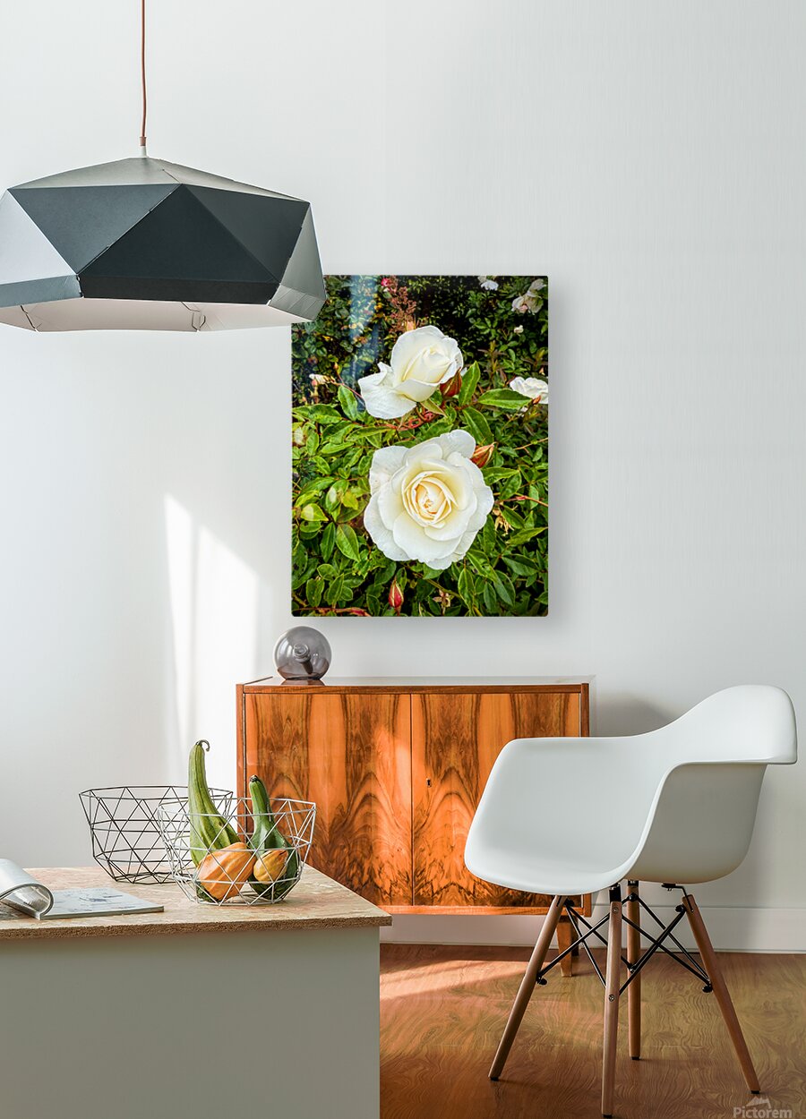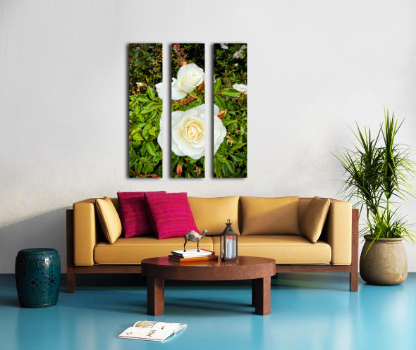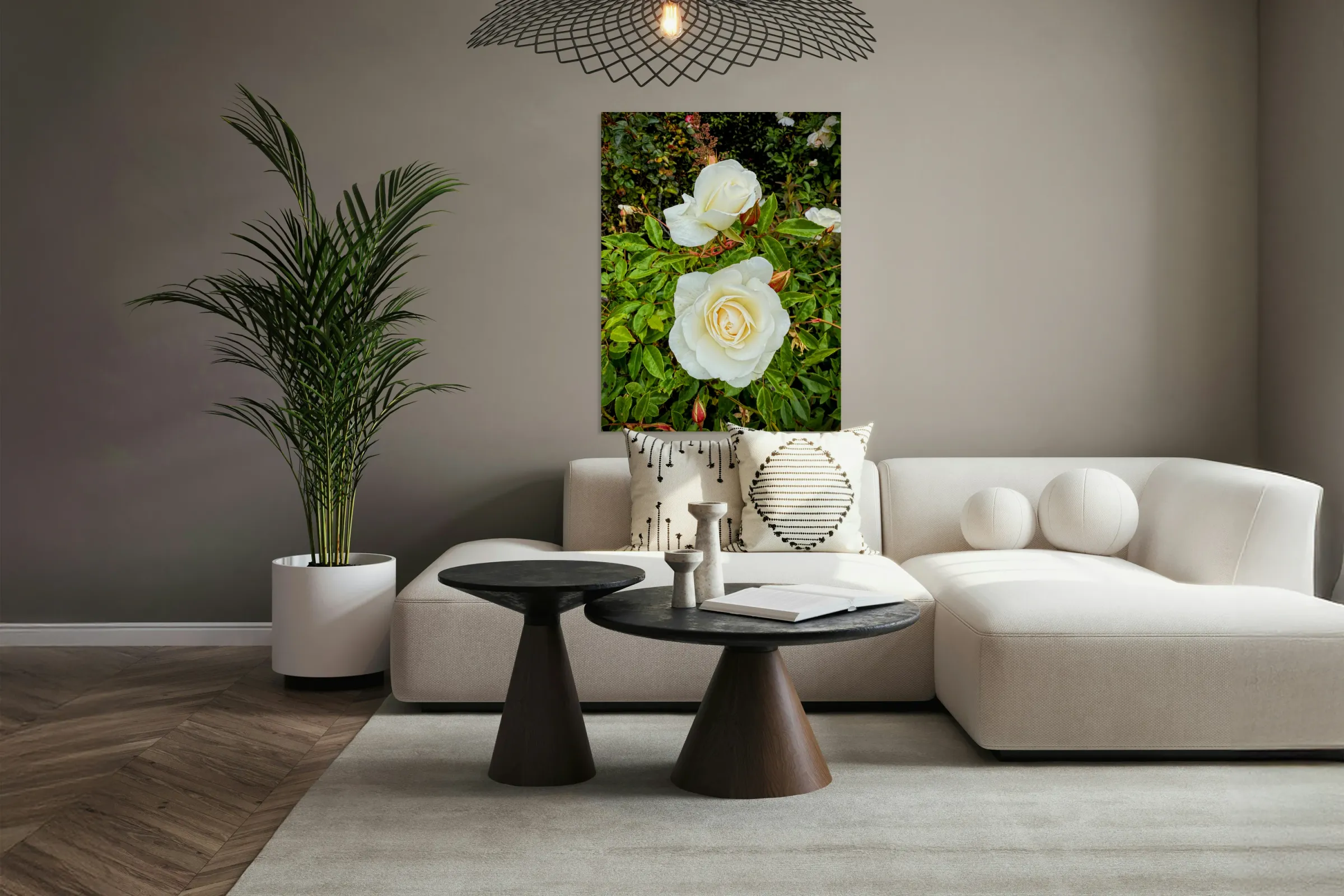 The roses, gleaming with a delicate sheen, evoke porcelain — timeless, fragile, yet resilient. They float amidst green whispers, untouched by haste. The image balances stillness with presence, ideal for curated spaces that invite clarity and grace. As wall art, it lends your room a fresh exhale — perfect for entryways, spas, or studios that seek to channel simplicity and natural refinement.