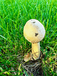 This photograph showcases a wild mushroom gently tilted under the caress of morning light, framed by blades of grass and nestled into a cradle of drie...[+]