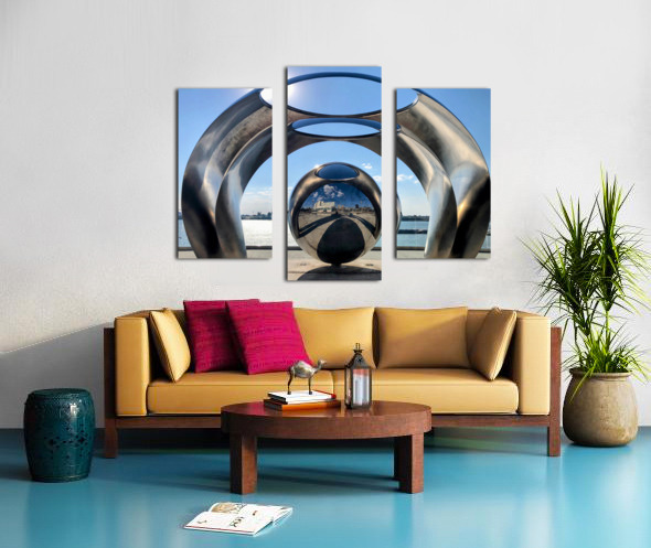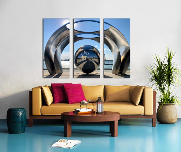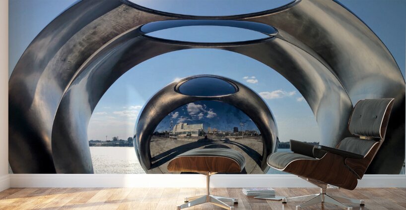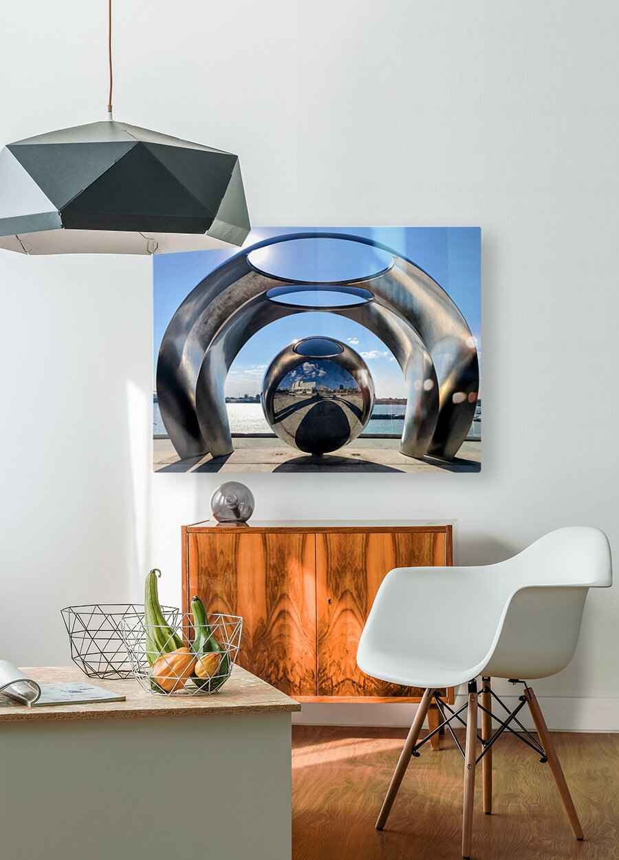 This spherical sculpture by the river walk in Baton Rouge is a beautiful public art piece worth checking out. Much like "The Bean" in Chicago, you can see your reflection in the sphere. This front-facing view of the monumental waterfront sculpture commands attention with its symmetrical arches and polished reflective sphere. The design draws the eye toward its precise center, where urban and natural worlds converge within a mirrored surface. A masterpiece of public art, the installation speaks to unity, balance, and cosmic alignment. As wall art, it functions as both focal point and philosophical anchor, ideal for corporate lobbies, modern homes, or meditation rooms.