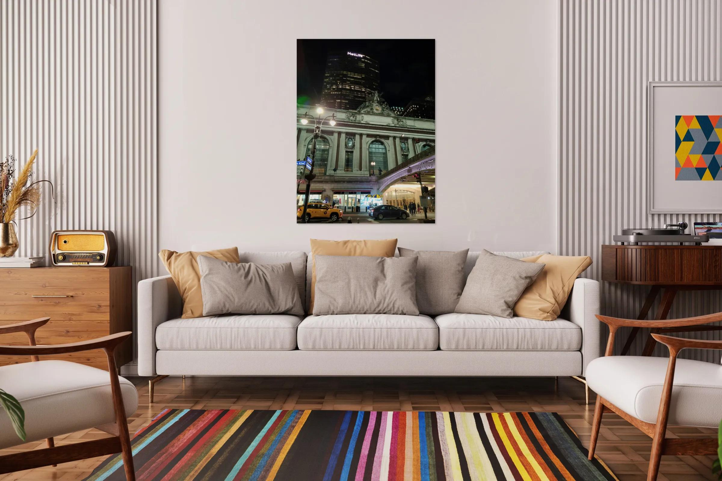 Grand Central Station is one of the iconic places of New York City and one of the busiest places in the world. New York City Collection. From the outside looking in, this view of Grand Central reveals the building’s masterful symmetry and vibrant context. The piece captures not only the grand design, but also the atmosphere of a city constantly alive, an elegant wall accent for urban enthusiasts or lovers of timeless architecture.