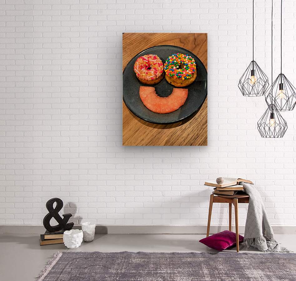 An image that captures the sweet side of optimism, this food arrangement brings a smile to your wall, literally. With two delightfully topped donuts for eyes and a soft pink grapefruit slice forming a smile, this artwork adds charm and playful positivity to any room. Ideal for spaces where joy and color are always welcome.