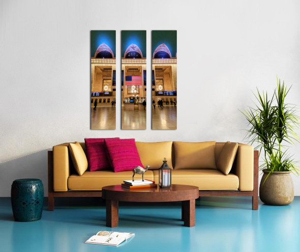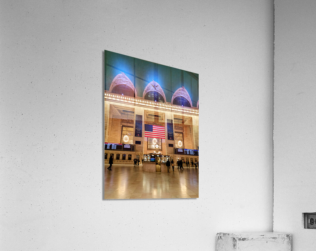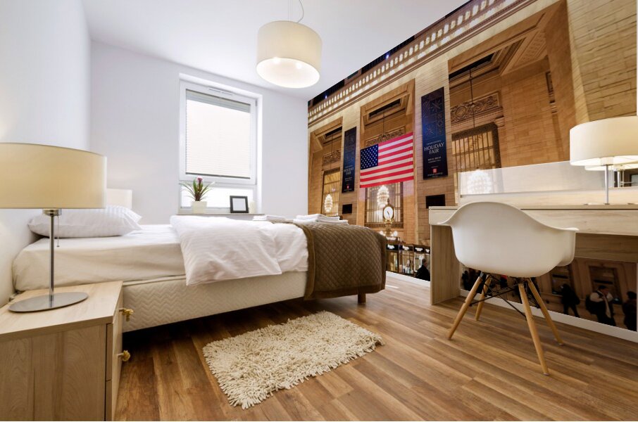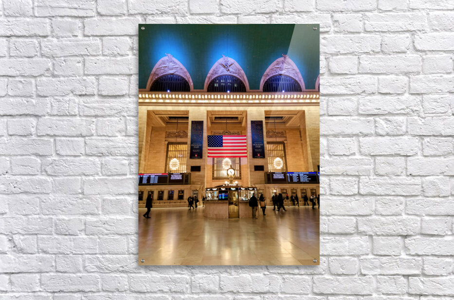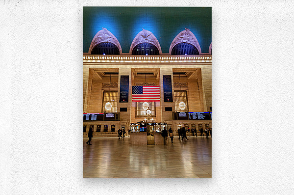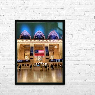 Grand Central Station is one of the iconic places of New York City and one of the busiest places in the world. New York City Collection. A bold look at New York City's Grand Central Terminal, framed by its monumental windows and glowing chandeliers. The central flag serves as a reminder of unity and perseverance. This artwork evokes both history and motion, ideal for urban homes, offices, or galleries seeking powerful American imagery.