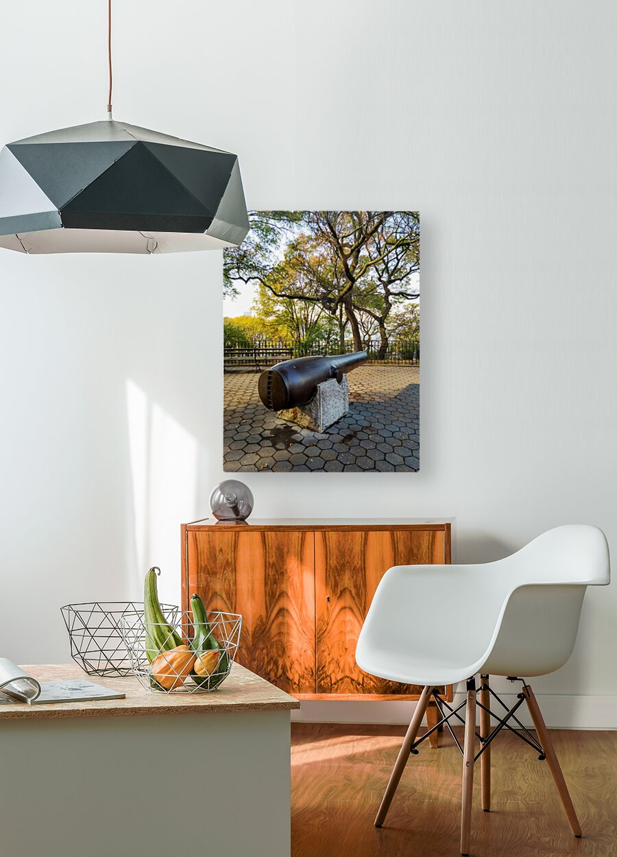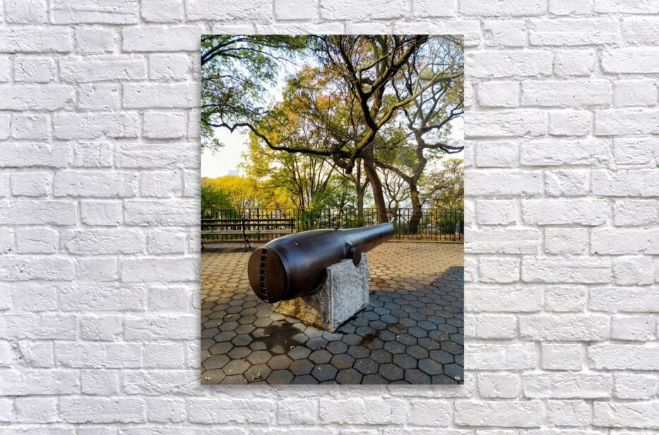 Riverside Park Collection. Fall in New York City is both romantic and beautiful as the leaves change colors. "The Quiet Barrel" draws attention to a once-loud instrument of war, now hushed in a tranquil park under a cascade of autumn leaves. The juxtaposition of strength and stillness makes this a powerful decorative statement, ideal for those who appreciate the stories behind still imagery.