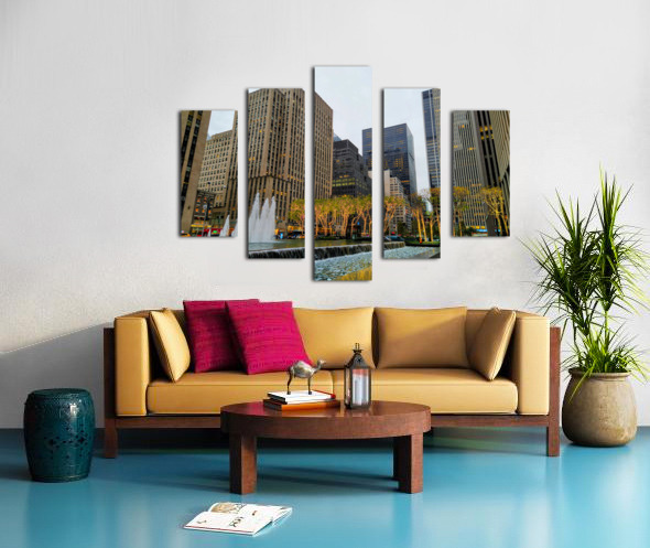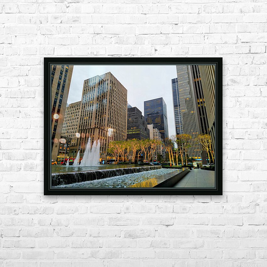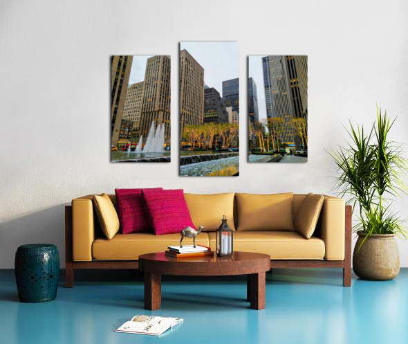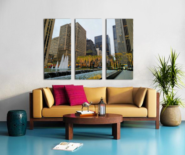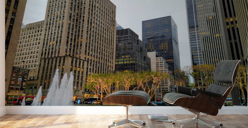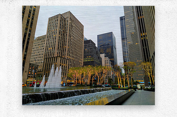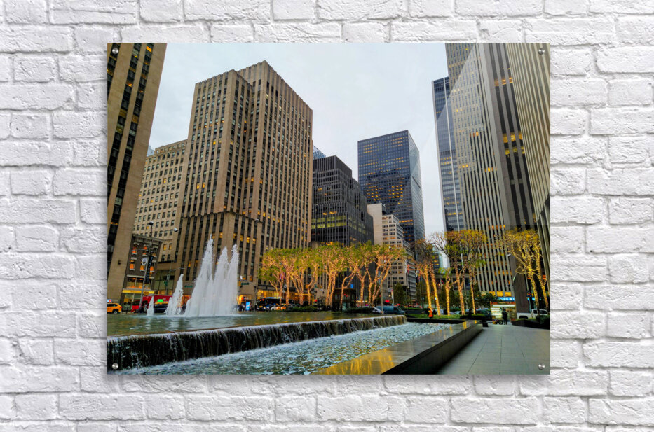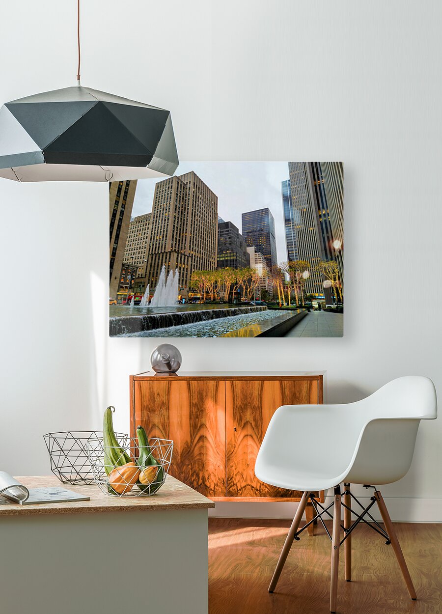 Midtown Manhattan starting to decorate for the holidays with the lighted trees. New York City collection. This photograph highlights New York City’s poised elegance, geometric architecture juxtaposed with illuminated trees and rippling fountains. It’s a scene that resonates with professionals and dreamers alike. As wall decor, it adds a polished and sophisticated tone to any space, embodying urban class and ambition.