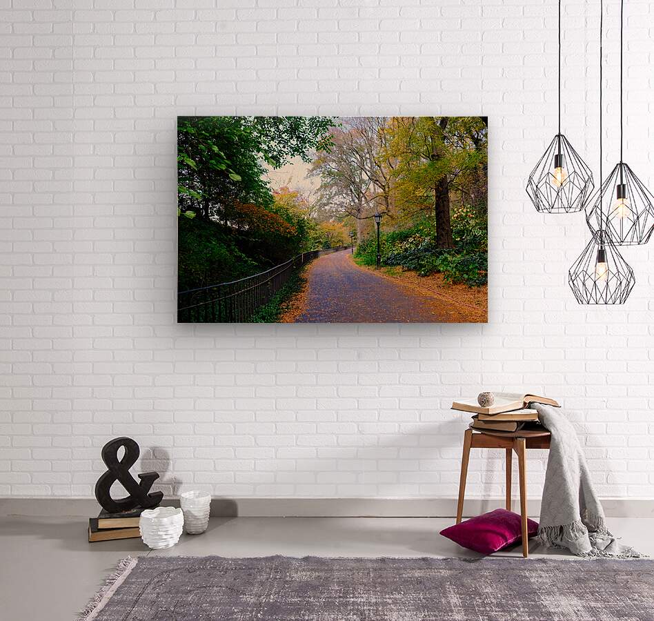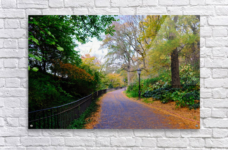 Fall in New York City is both romantic and beautiful as the leaves change colors. Central Park Collection. This photograph captures the quiet elegance of an autumn path winding through Central Park. Lined with golden leaves and framed by trees in transition, the scene evokes a sense of serenity and reflection. As wall art, Autumn Stroll brings a calming natural rhythm to your space, perfect for invoking a peaceful, seasonal ambiance in any room.