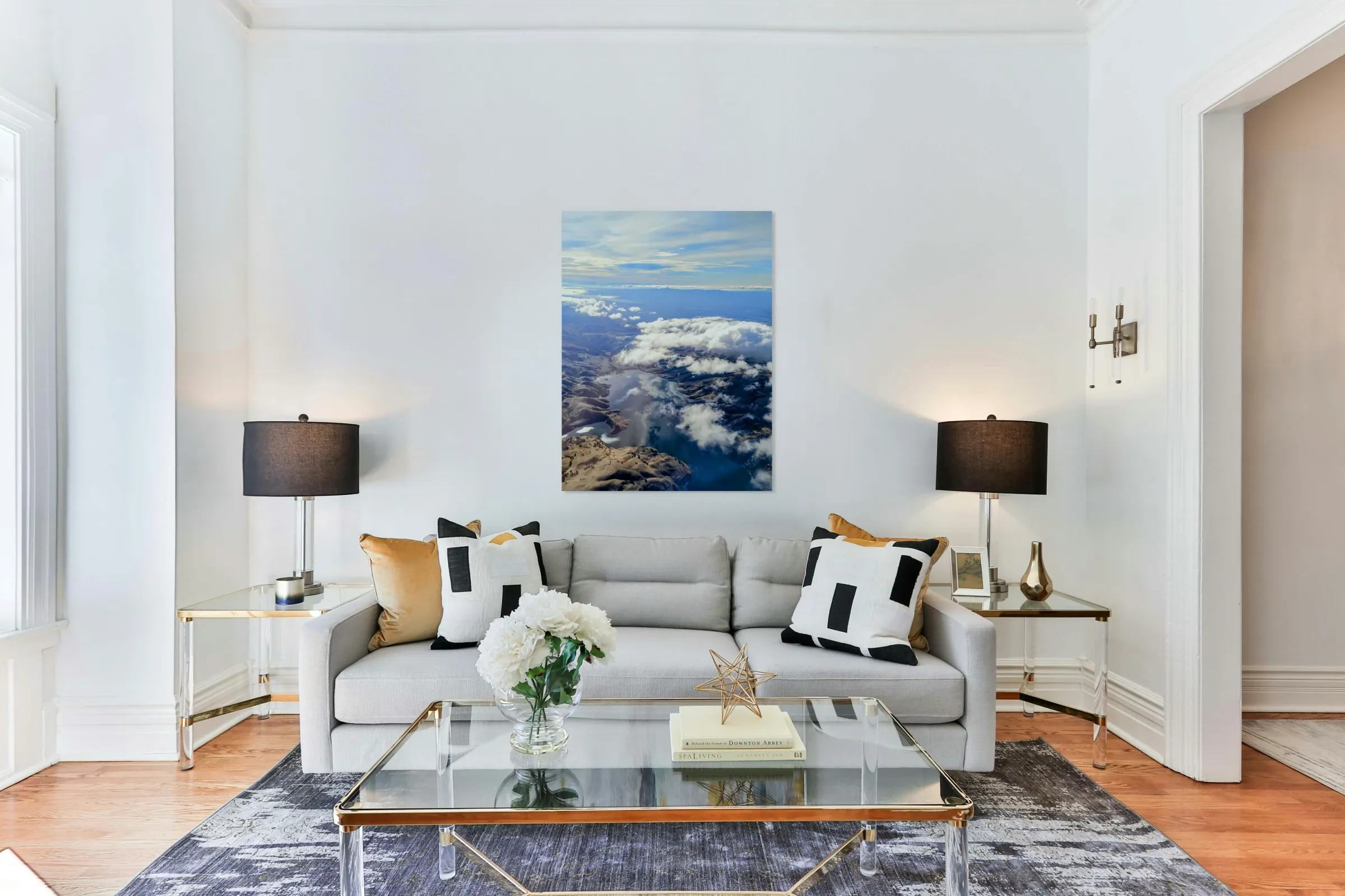 Gently rolling hills meet shimmering water as the sky kisses the earth through scattered clouds. This artwork delivers a sense of weightless peace, making it a perfect contemplative piece for minimalist or nature-inspired interiors.