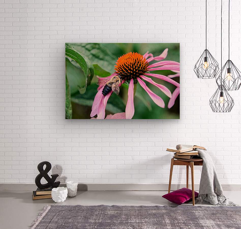 The Bee Collection. A quiet stillness emerges in this moment of purposeful pause, a bee resting mid-meal atop the spiky crown of an Echinacea purpurea bloom. The flower’s radial symmetry contrasts with the soft fuzz of the bee’s back and the delicate lace of its wings. In this small act, life renews itself. Perfect for those who value patience and presence, this artwork encourages a connection to rhythm and rest. Its refined natural palette and rich detail bring timeless energy to both minimalist and organic interior designs. A contemplative focal point for any room.