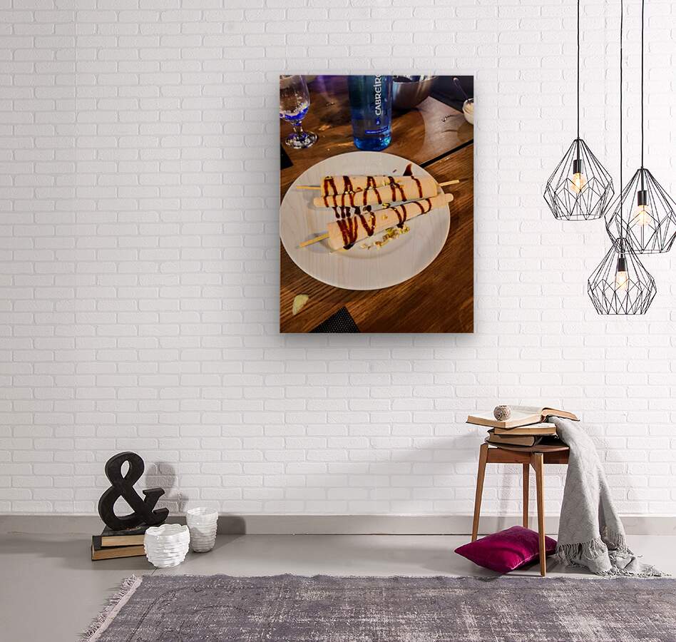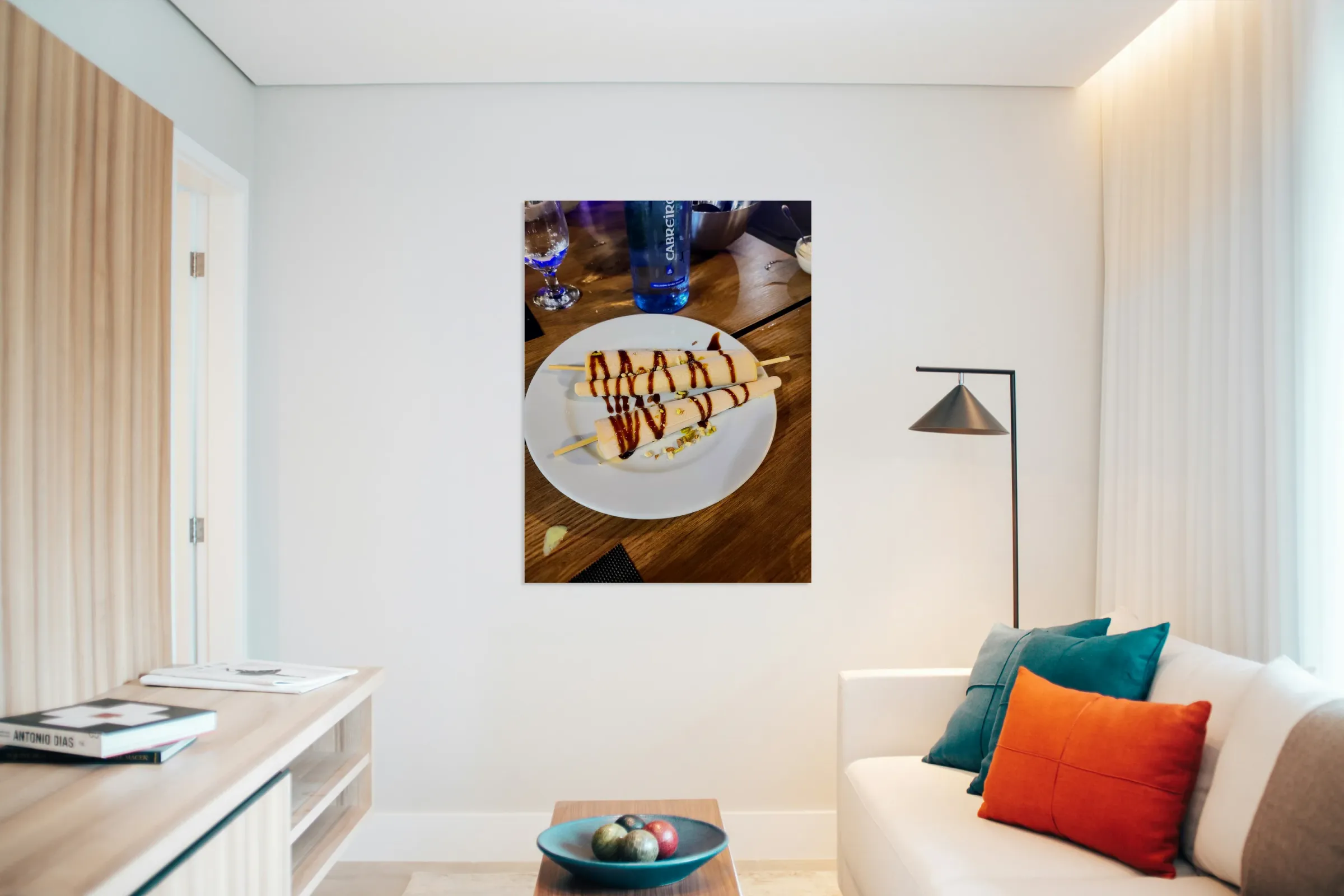 Transforms the concept of dessert into a minimalist symphony of form and flavor. The parallel kulfi sticks become instruments in a sweet concerto, where the flowing caramel becomes musical notation—fluid, expressive, and rich. There’s a graphic rhythm in the lines, a balance in the plating, and a story told in texture and tone. This artwork is ideal for contemporary dining spaces, creative studios, or restaurants where design meets deliciousness. It’s food photography with a bold sense of structure and soul.