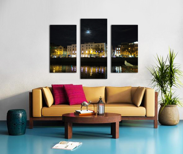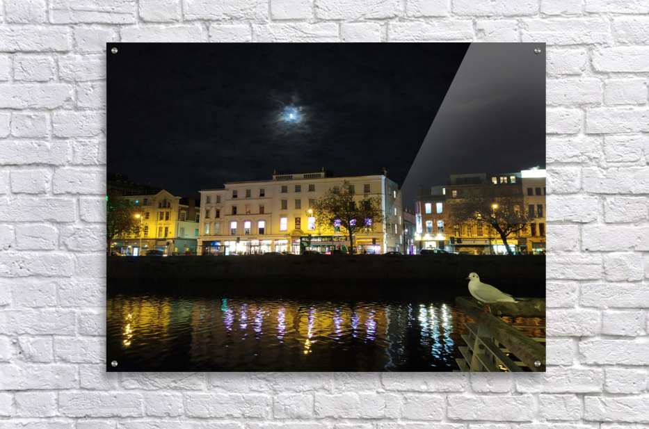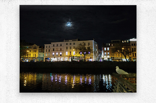 Dreams of Dublin Series. The hustle and bustle of Ireland's business center along River Liffey glimmers peacefully at night. This little seagull pensively looks up to the glimmer of moonlight that peeks through the rolling clouds.